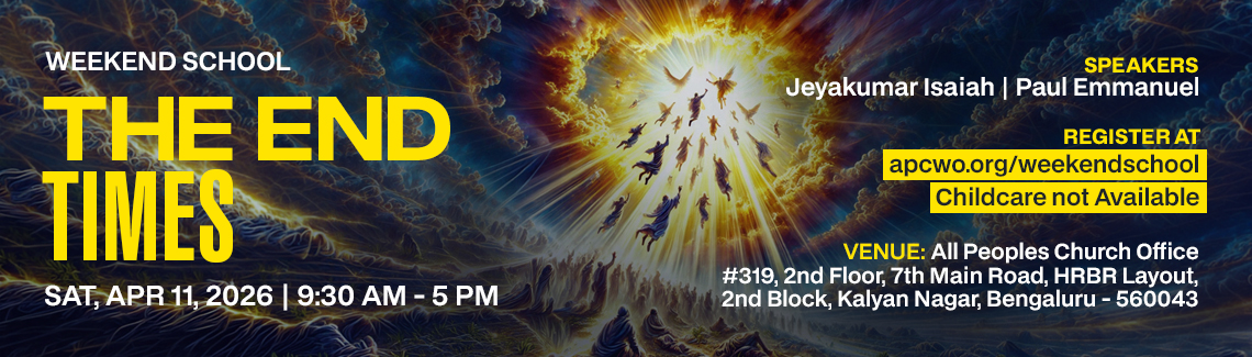 All Peoples Church in Bangalore is a Spirit-filled, Word-based, Bible-believing Christian fellowship of believers in Jesus Christ desiring more of His presence and supernatural power bringing transformation, healing, miracles, and deliverance. We preach the full Gospel, equip believers to live out our new life in Christ, welcome the Charismatic and Pentecostal expressions in the assembly of God and serve in strengthening unity across all Christian churches. All free resources, sermons, daily devotionals, and free Christian books are provided for the strengthening of all believers in the Body of Christ. Join our services live at APC YouTube Channel. For further equipping, please visit APC Bible College.